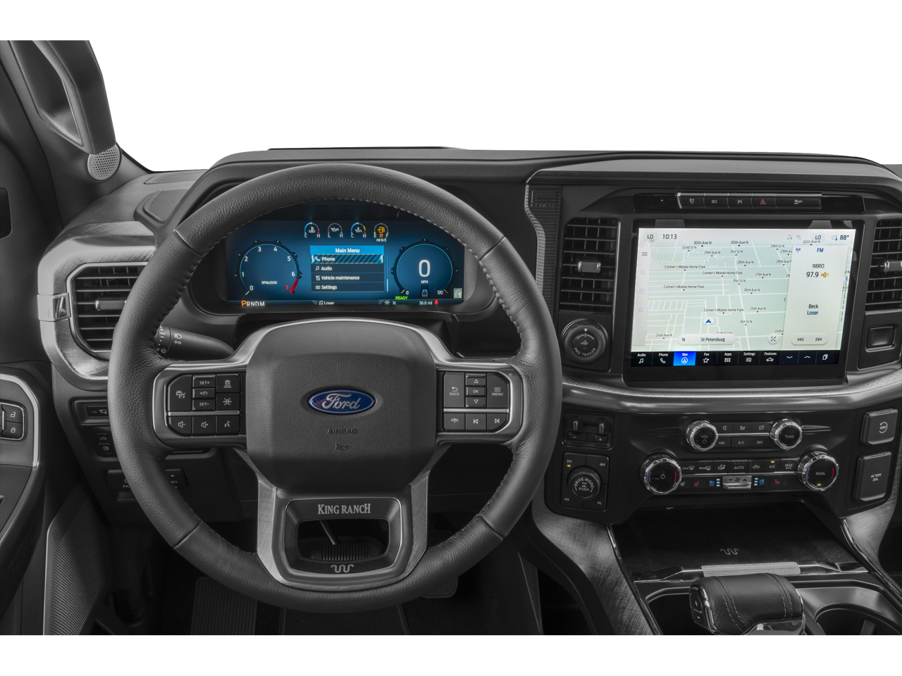 FX4 Off-Road Package: Off-Road Tuned Front Shock Absorbers; Skid Plates; Monotube Rear Shocks; 4x4 FX4 Off-Road Bodyside Decal; Hill Descent Control; Tray Style Floor Liner with Carpet Mats. Equipment Group 601A High: 275/60R20 BSW A/T Tires; King Ranch Multicontour Leather Bucket Seats; B&O Unleashed Sound System by Bang & Olufsen Radio; 20" Chrome-Like PVD Wheels. Tough Bed Spray-In Bedliner. Front and Rear Molded Splash Guards. SecuriCode Keyless-Entry Keypad. Tray Style Floor Liner with Carpet Mats. Skid Plates. **Equipment listed is based on original vehicle build and subject to change. Please confirm the accuracy of the included equipment by calling the dealer prior to purchase.**