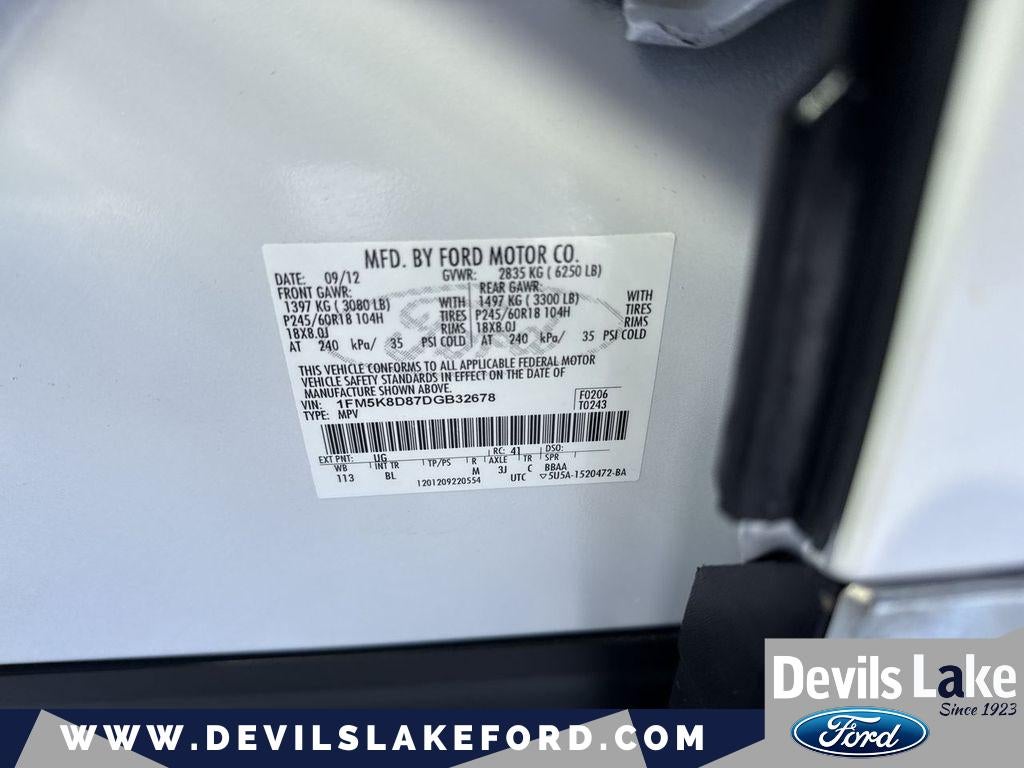 Equipment Group 202A: 3.65 Axle Ratio; Rearview Camera; Dual Zone Electronic Temperature; 3.5L Ti-VCT V6 Flex Fuel Engine; P245/60R18 AS BSW Tires; 6. 160 lbs GVWR; 18" Painted Aluminum Wheels; AM/FM Stereo with Single CD with Premium Audio. Comfort Package: Leather-Trimmed Heated Bucket Seats. Trailer Tow Package (class III): 4.7 Pin Wiring Harness; Engine Oil Cooler. Driver Connect Package: SYNC with MyFord Touch; SYNC with MyFord Communications/entertainment System; Electrochromic Interior Rearview Mirror. Dual Panel Moonroof. 2nd Row Bucket Seats. White Platinum Met TC. Power Liftgate. **Equipment listed is based on original vehicle build and subject to change. Please confirm the accuracy of the included equipment by calling the dealer prior to purchase.**